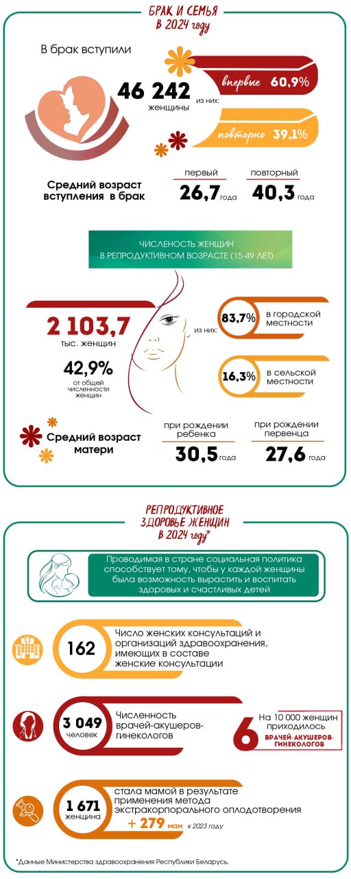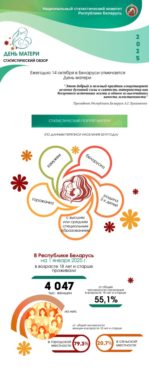 Статистический обзор ко Дню матери (14 октября) В Беларуси на 1 января 2025 г. в возрасте 18 лет и старше проживали 4 047 тыс. женщин из них 55,1%- матери В 2024 году в брак вступили 46 242 женщины Средний возраст вступления в брак: первый- 26,7 года повторный- 40,3 года Средний возраст матери при рождении ребенка - 27,6 лет ЗАНЯТОСТЬ ЖЕНЩИН в возрасте 18-58 лет в 2024 году - 2 232 тыс. женщин из них 48% имели несовершеннолетних детей · 56,9% имели 1 ребенка · 33% имели 2 детей · 10,1% имели 3 и более детей